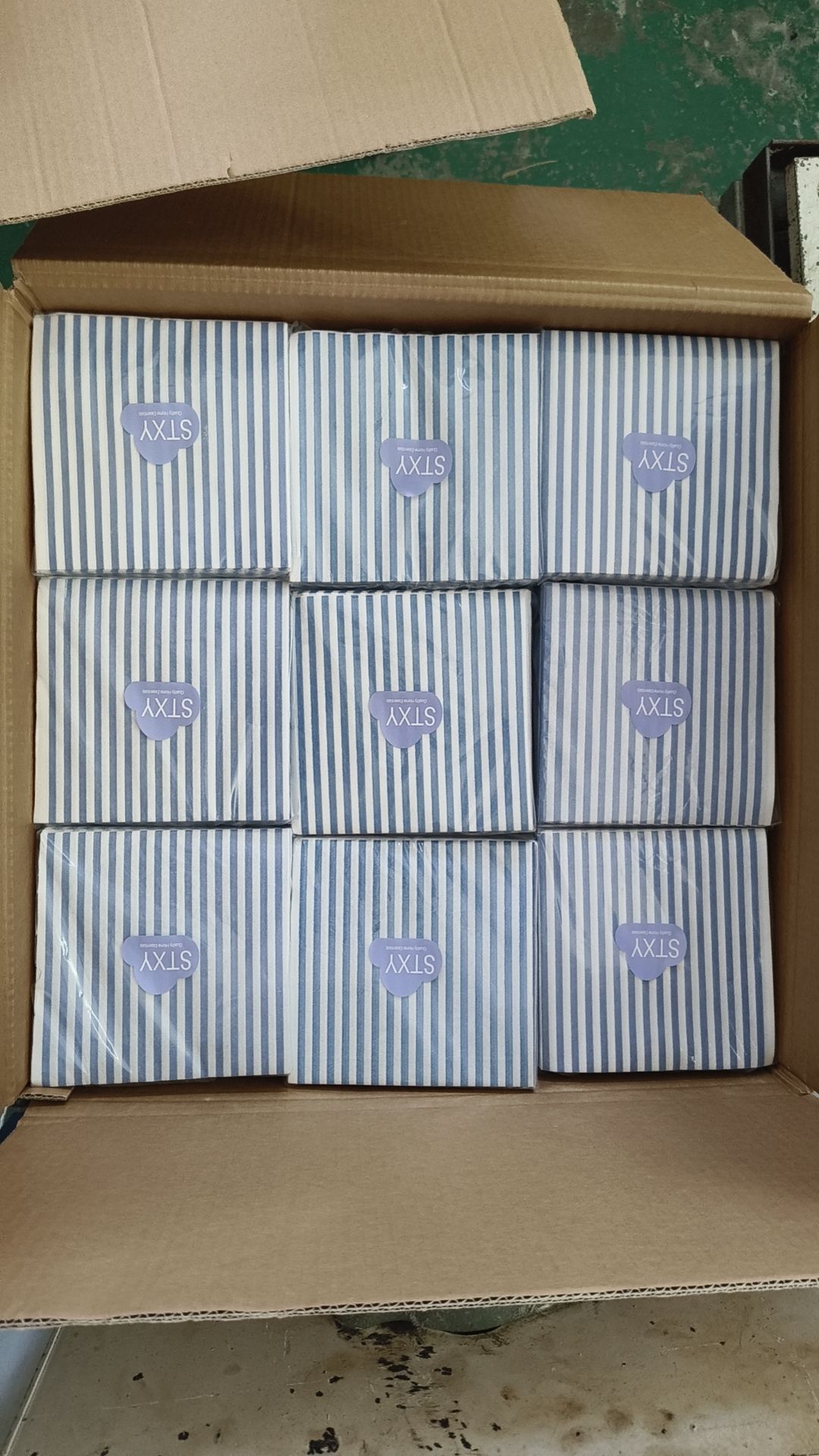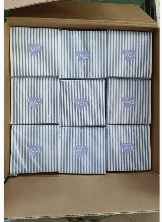 Pack of 85 luxury disposable napkins We company recently developed the new products:33x33cm with blue stripe,16.5x16.5 folded,85 pcs per pack with strong Absorbent,Linen-like feel Suitable for Dinners, Kitchen, Parties, Weddings, Christmas Party,ect.